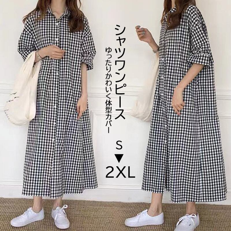 新作 レディース ギンガムチェック シャツワンピ 体型カバー ブラウス ロング丈 半袖