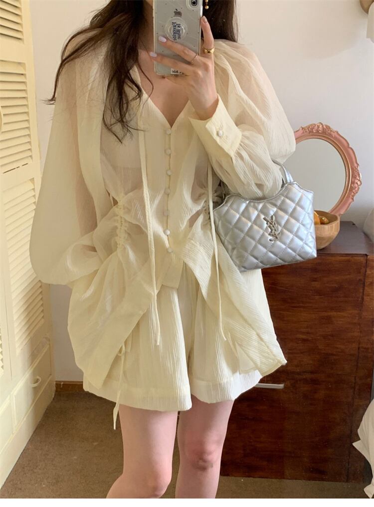 長袖 シャツ Vネック レースアップ 上着 ハイウエスト ワイドパンツ