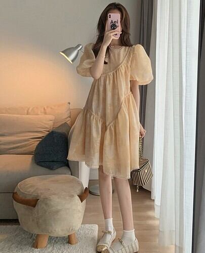 妊婦 パフスリーブチュールワンピース